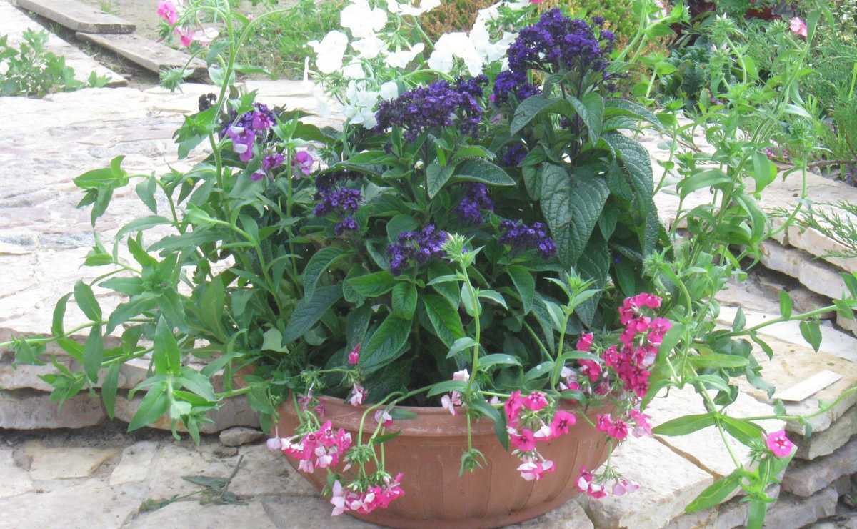 Если высаживать гелиотроп вместе с флоксом, то норма посадки должна быть следующей: на ёмкость диаметром 40 см три растения гелиотропа и 5 флокса. Слишком уплотнять посадки не стоит.