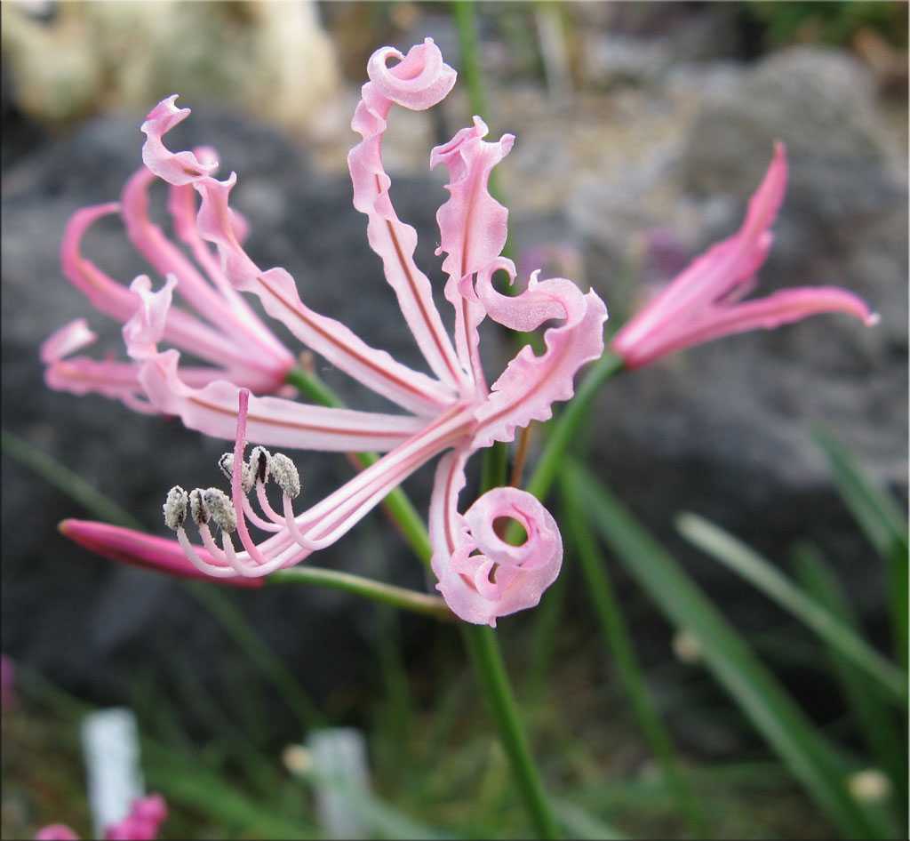 . Родина – Южная Африка. Луковичное многолетнее растение. Луковица расположена большей частью над землей, вытянутая, до 5 см дл. Наружные чешуи сухие блестящие, светло-коричневые. Удлиненные замкнутые листовые влагалища образуют небольшой ложный стебель (до 5 см). Листовые пластинки до 30 см длиной и до 2,5 см шириной, линейные, ремневидные, постепенно суженные на верхушке, слегка желобчатые, блестящие, с многочисленными жилками. Зонтиковидное соцветие, расположенное на безлистном цветоносе до 45 см выс., несет в основании присоцветный лист, розовеющий по мере старения. Цветков 6-12, листочки околоцветника закрученные, розовые, с темной продольной линией. Цветет осенью (в октябре) перед появлением листьев или одновременно с их появлением. В культуре с 1904 г.