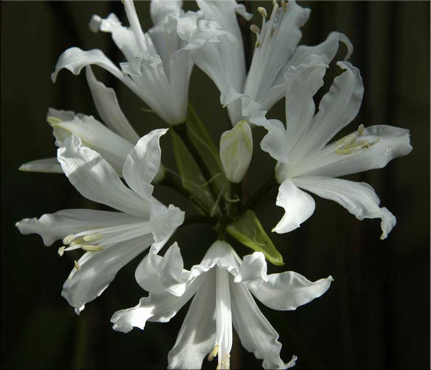 Одиночный цветонос, голый без листьев, доходит до 40 см длиной. На зонтиковидном соцветии развивается от 3-х до 6-ти цветков. Периантий (околоцветник) при основании имеет вид коронки из- за сросшихся тычинок в нижней части и тонких перепонок между ними. Диаметр коронки около 5-ти см. Сама коронка белого цвета, крупная, с бахромой по краю.