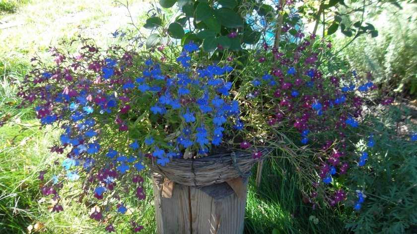 Лобелия ампельная отлично себя проявляет в контейнерной посадке, за короткий промежуток времени способна разрастись до состояния пышного цветочного «водопада».