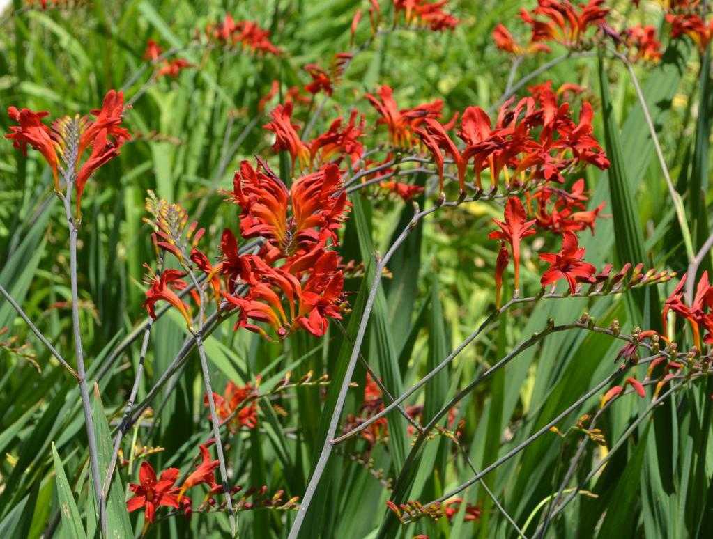 Их яркое цветение продолжается все лето, почти до начала заморозков. Цветы — ярко-оранжевые, красные, либо желтоватые. Второе название цветка — крокосмия.