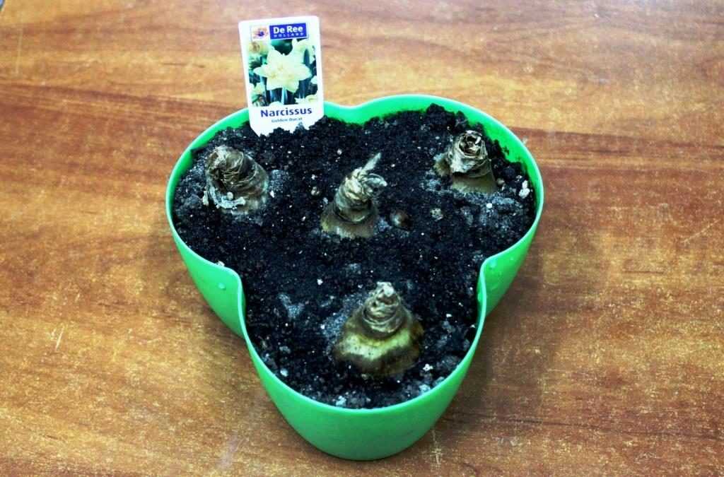 Для высадки луковиц нарциссов используют ящики, горшки, контейнеры или стеллажи, где находится земляная смесь. Готовая земляная смесь представляет собой смесь земли листовой и рыхлой супесчаной в соотношении 1:2. Обязателен дренаж в виде речного песка, перемешанного с черепками глиняного горшка. Главное, чтобы луковички возвышались на пару сантиметров от уровня земли.
