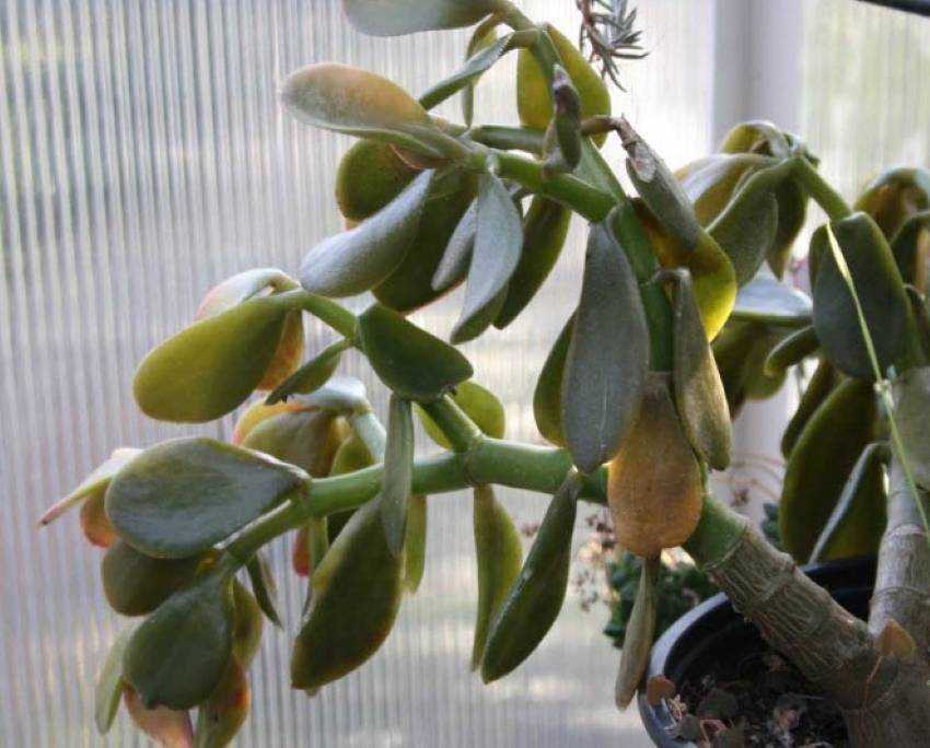 - Нарушение интенсивности освещения. При попадании прямых солнечных лучей водянистые листовые пластины перегреваются. От полученных ожогов они краснеют, постепенно высыхают, сыплются с веток. Недостаток освещения цветок компенсирует вытягиванием веток. Листочки при этом мельчают, опадают с кроны по направлению снизу от основания ствола до верхушки.