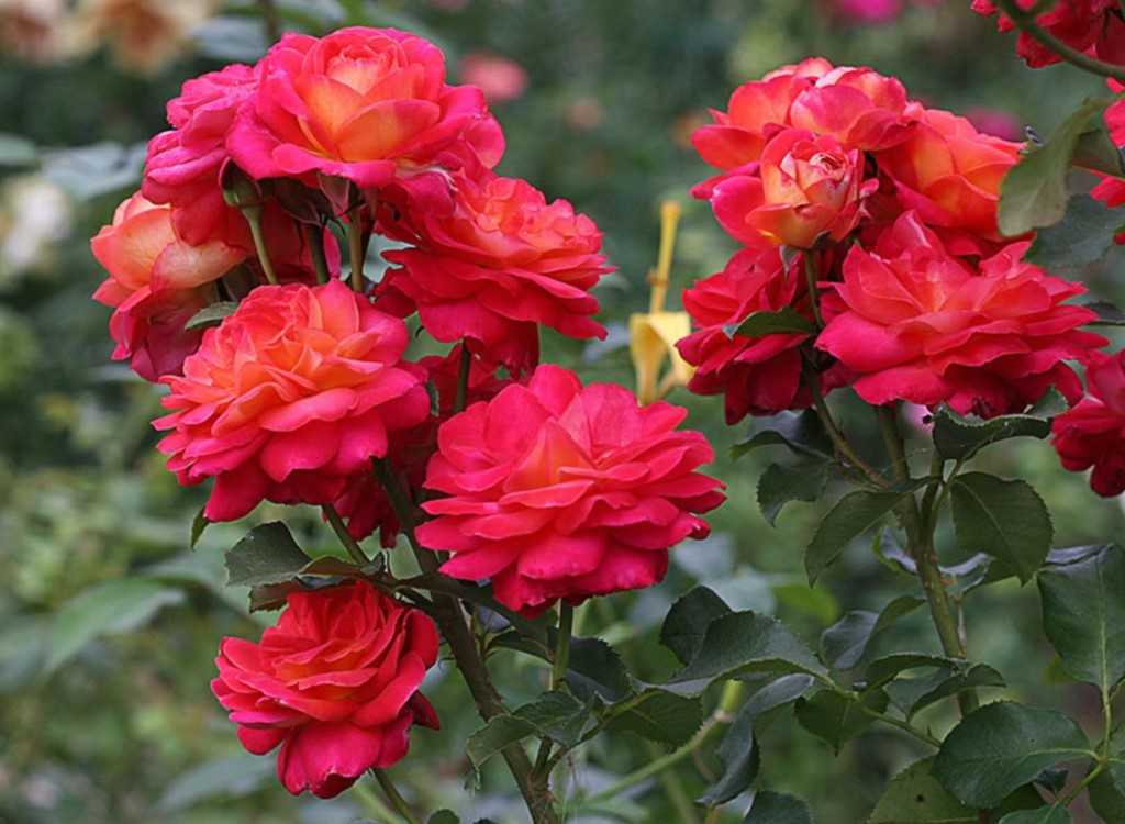 - Румба. Удивительная роза, меняющая свой окрас по прошествии времени: сначала лепестки желтые с красной окантовкой, а затем становятся карминово-красными. Цветет непрерывно с конца июня до поздней осени. Цветки средние (5-7 см), собраны в кисти по 10-15 штук. Кусты компактные, листья очень густые, декоративные.