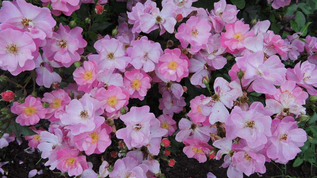 - Почвопокровные. Здесь собраны культивары, полученные при гибридизации карликовых роз с плетистыми. Кусты с длинными ветвями, стелющегося типа. Соцветия мелкие, однако цветение обильное, продолжается до 4 месяцев. Сорта спокойно переносят морозы, а также практически не болеют.