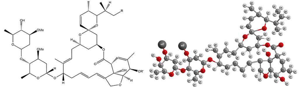 Технический аверсектин С, используемый для приготовления Актофита, есть смесь 8-ми авермектинов – изомеров одной и той же базовой молекулы (см. рис.) с различными органическими радикалами и атомами металлов. Приготовляется эта смесь культурой Streptomyces avermectilis. Разделение ее на компоненты возможно лишь с большим трудом в лабораторных условиях, а целенаправленный синтез их порознь на современном уровне химической технологии технически невозможен. Если вы встретите утверждения обратного толка, то они – откровенная ложь.