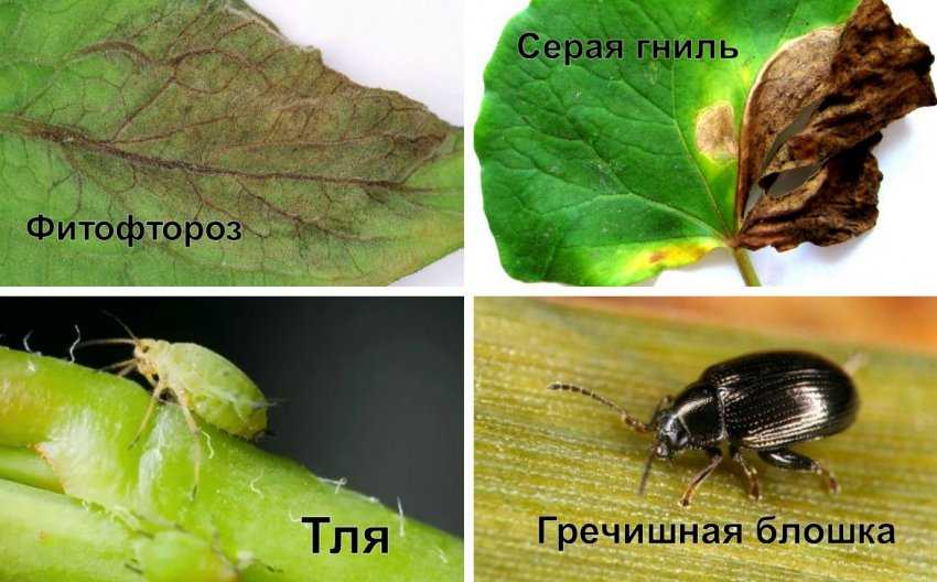 | Фитофтороз | бурые пятна на стеблях и листьях | Обработка бордосской жидкостью (1%). |