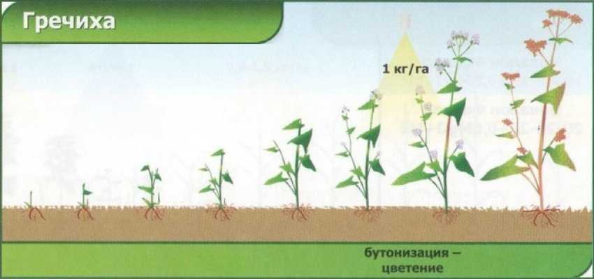 Жизненный цикл растения включает 2 стадии. Первая из них — вегетативная, когда происходит развитие корневой системы, побегов, листьев. Вторая — генеративная, которая включает формирование бутонов, соцветий, плодов. В зависимости от того, в какой стадии пребывает гречиха, ей необходимы разные мероприятия по уходу и условия.