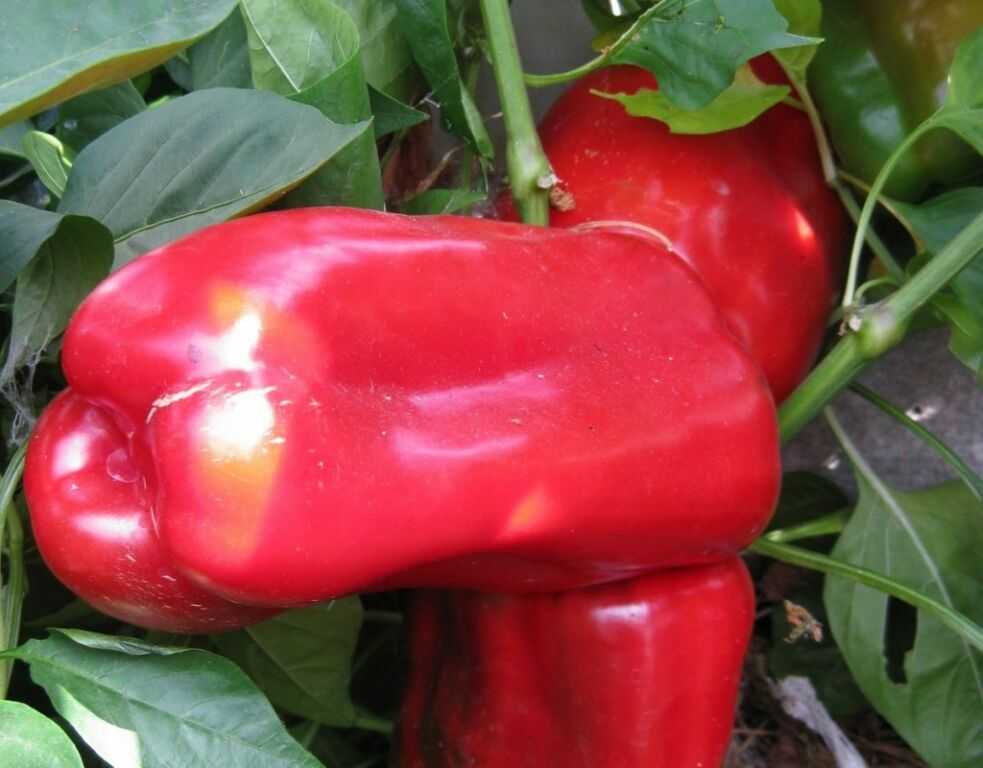 Стоит обратить внимание на то, что семена этого перца собирать бессмысленно, так как сорт гибридный. Плоды крупные, красного цвета, пониклые, имеют форму конуса, кончик притуплен, имеются грани