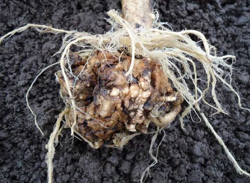 Возбудитель болезни может паразитировать в грунте более 10 лет. Часто килу распространяют насекомые, сорняки. На корешках овощной культуры образуются утолщения, напоминающие орехи. Зараженная поросль постепенно засыхает. Растение прекращает развиваться. Пораженные кустики уничтожают. Не допускают переувлажнения грунта. Кустики высоко окучивают. Используют препарат НВ-101.