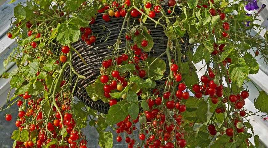 Контейнерные томаты, помидоры Hundreds and Thousands при выращивании в подвесном кашпо
