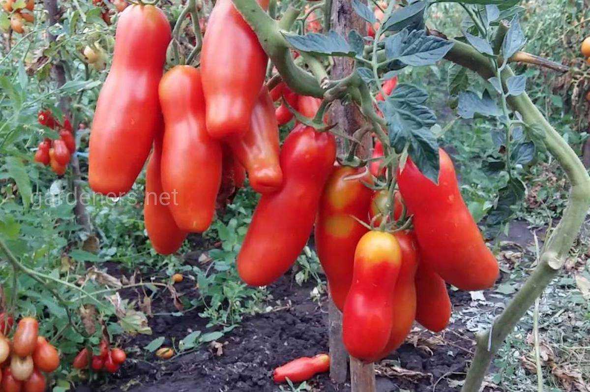 Ниагара* – среднеспелый (100-115 дней) сорт, названный так за сходство плодовой кисти с водопадом. Куст дает 2-3 стебля, на каждом формируются кисти с 10-15 плодами массой 80-100 г. Ягоды сливовидной формы, с небольшим «носиком» на конце, мясистые, с тонкой кожицей. Пригодны для вяления и приготовления соков, соусов, кетчупа. Урожайность – до 10 кг с куста. Сорт устойчив к заболеваниям, хорошо образует завязи. Из недостатков – вероятность осыпания плодов от ветра или случайного прикосновения, поэтому лучше выращивать в теплице и на опорах.