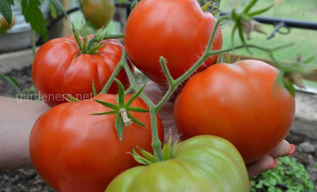 - масса плода, цвет и тип:круглые, но как будто сплюснутые по бокам; окрашены в красный цвет; масса одного томата может достигать 150 граммов;