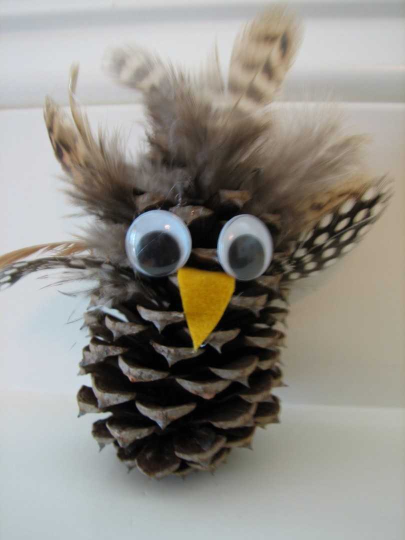 - Собрать фигурку как конструктор. Прикрепить бусинки вместо глаз. Забавная поделка из пластилина и шишки готова!