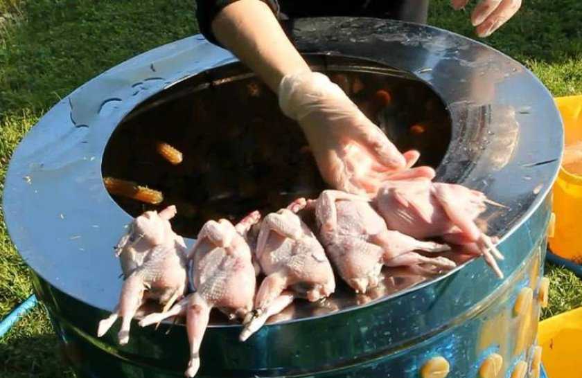 Чтобы эффективность была выше, в машину добавляют воду. Она защищает тушки от повреждений и смывает лишнее перо.