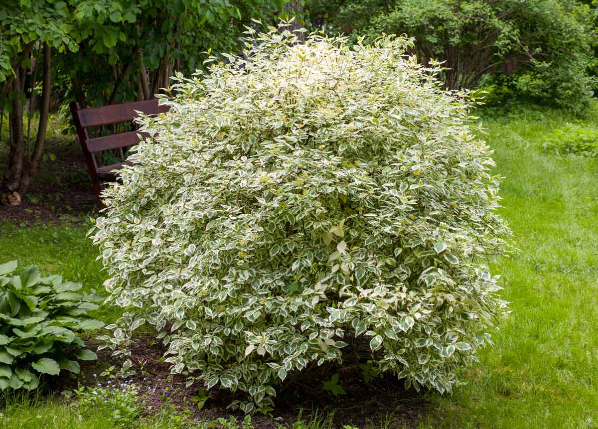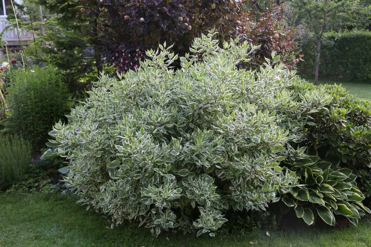 Дерен белый Элегантиссима (‘Elegantissima’). Высота кустарника около 3 м. Этот сорт очень зимостоек. Весьма эффектны красные побеги, особенно яркие они зимой. Листья дерена белого Элегантиссима имеют кремово-белое широкое окаймление неравномерной ширины, а также полоски и пятна. Очень быстро растет.