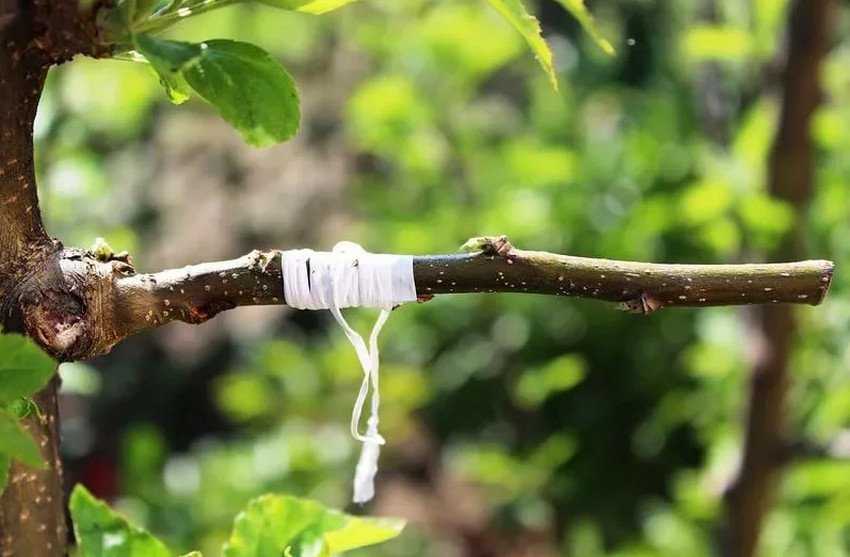 - Чтобы ветка черенка хорошо зафиксировалась под корой, стоит обмотать ствол бечевкой. При этом не нужно слишком сильно затягивать веревку.