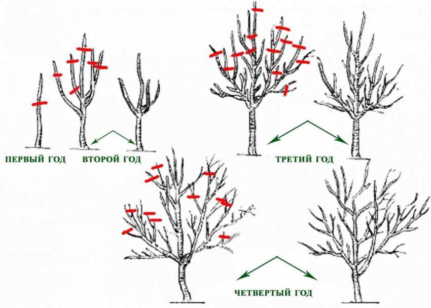 Крону формируют у деревьев, которым ещё не исполнилось 5 лет. С первого года посадки срезают на треть все ветви, оставляя при этом центральный проводник на 20–25 см выше. Когда крона уже сформирована, и у яблони есть 3–4 яруса веток, производят лишь поддерживающую обрезку, в ходе которой удаляют неправильно растущие побеги.