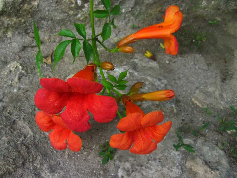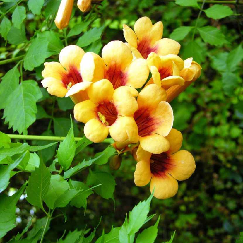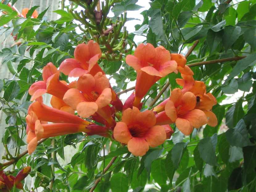 Кампсис укореняющийсяимеет на стеблях воздушные корни, которыми крепится к опоре. Листья снизу опушенные, цветы до 10 см в длину и 5 см в диаметре образуют кисти по 10-15 шт. Кампсис укореняющийся наиболее приспособлен для выращивания в Средней полосе. В более северных районах он тоже отлично растет, если за ним правильно ухаживать и хорошо утеплять на зиму.