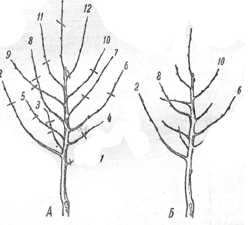 Большое число ветвей в мутовках значительно ослабляет рост ствола, а смежное их расположение делает скелет плодового дерева непрочным и морозонеустойчивым.