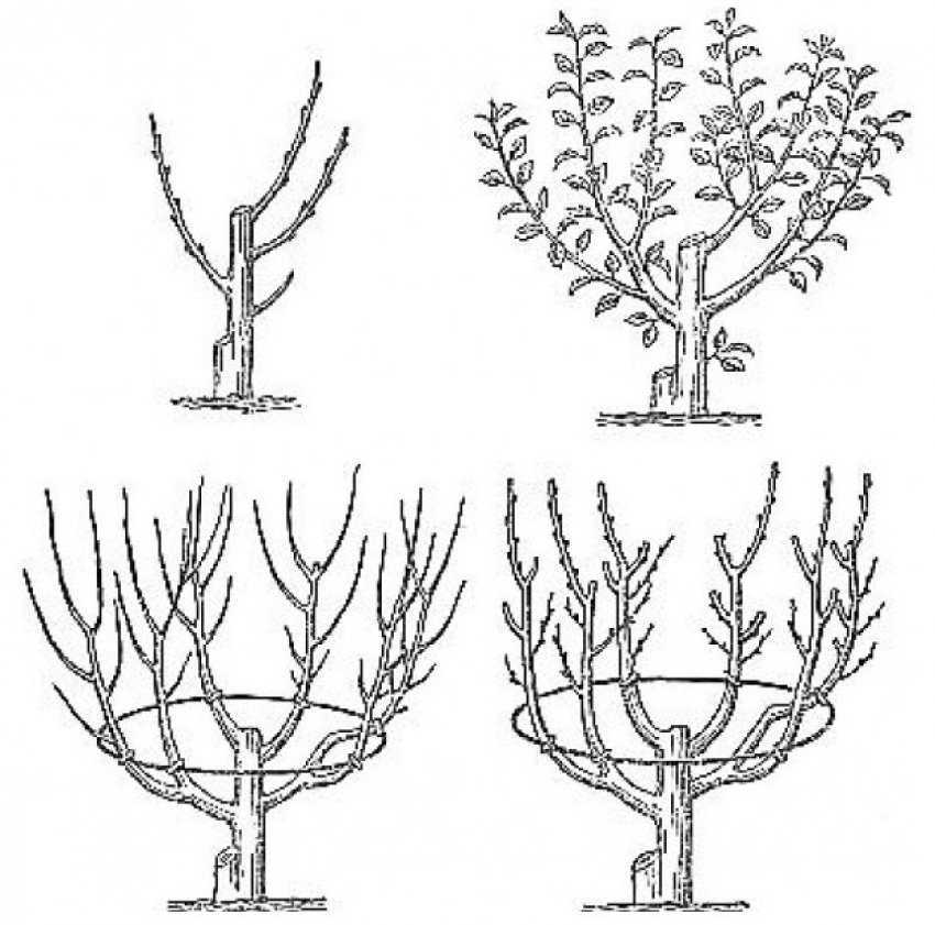 - На следующую весну из сформировавшихся боковых побегов оставляют 3–4 наиболее развитых, расположенных примерно на одной высоте и направленных в разные стороны. Они должны составлять со стволом угол примерно 60°. Прочие ветви срезают до точки роста. Выбранные укорачивают над 2–3 почкой (остаётся примерно 20–25 см). Центральный проводник срезают в 30 см над верхней скелетной ветвью.