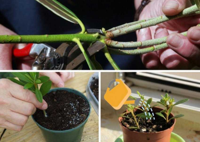 Черенкование проводиться в середине июля – начале августа. Для этого выламывают однолетние побеги длиной около 10 см и срезают почки с верхушек. У крупнолистых видов на треть обрезают листья, чтобы влага испарялась как можно меньше. С нижней части побега листья удаляют вообще, в земле они могут загнивать, оставляют, порядка, 4–6 листьев.