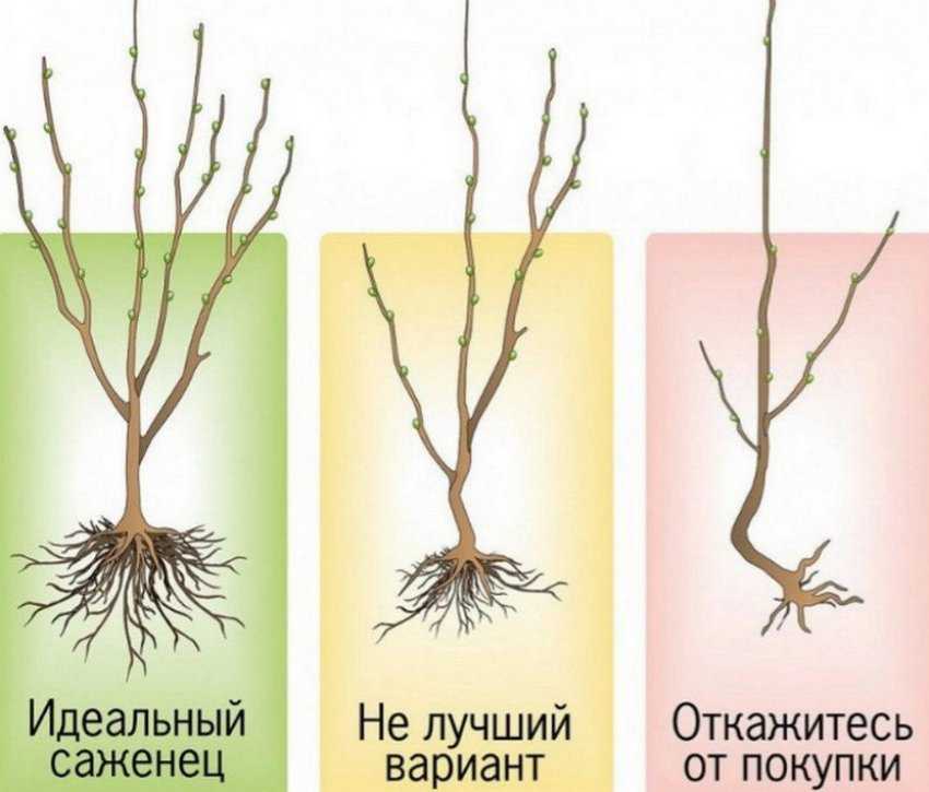Для покупки посадочного материала нужно отправляться в специализированный магазин либо проверенный питомник. С рук приобретать его не стоит, поскольку в таком случае нет гарантии, что вам продадут именно тот сорт, который вы желаете. У качественного саженца хорошо развита корневая система, отсутствуют пятна и наросты на корневой шейке и коре, у двухлетних экземпляров есть несколько побегов.