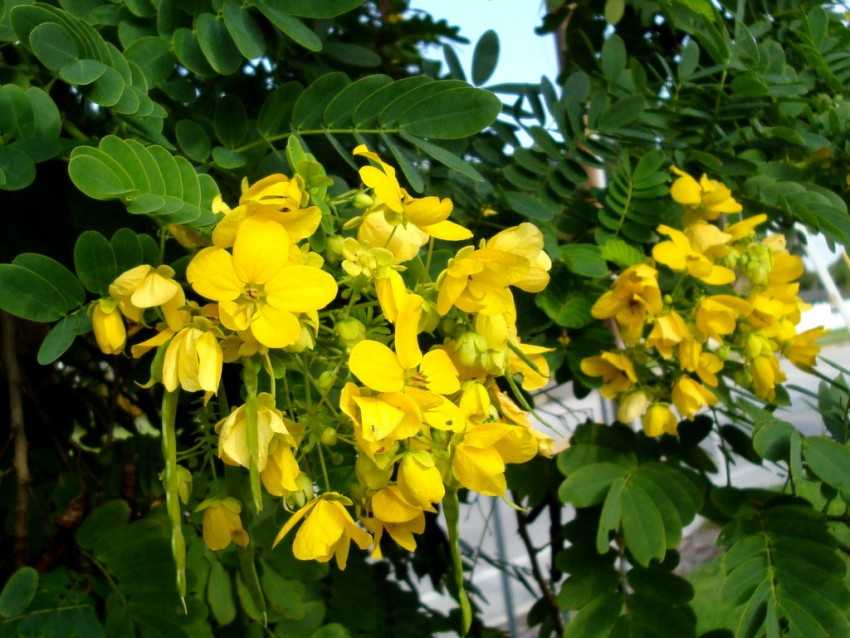 - Из акации самшитолистной получится чудесная изгородь с удивительными гроздьями желтых соцветий.