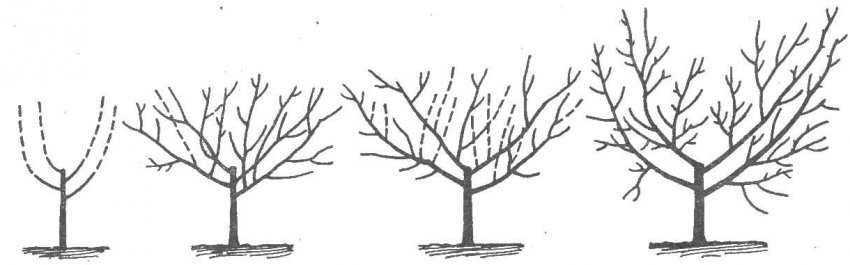 Через 3 года после посадки, когда слива достигнет высоты не менее 1 м, начинают формирование кроны. Центральный ствол укорачивают на 30 см — это стимулирует рост боковых побегов. Конечная форма должна напоминать чашу: укороченный центральный ствол и 4 уходящих вверх под углом 45° боковых побега. Это обеспечивает равномерное освещение всей кроны и хорошую циркуляцию воздуха.